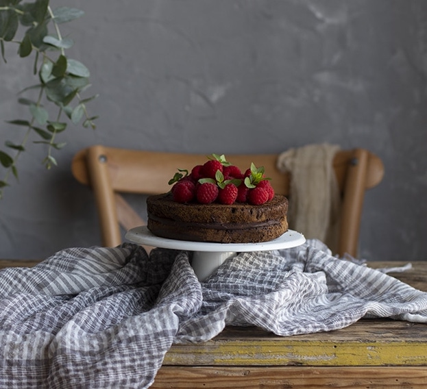 Cuando haya perdido temperatura el chocolate vertemos sobre una de las capas de bizcocho, extendemos bien con una espátula, cubrimos con la otra capa de bizcocho. Y si nos sobra chocolate podemos extenderlo sobre la cobertura. Llevamos a la nevera y sacamos media hora antes de servir. Decoramos con unas frambuesas frescas y con unas hojas de menta o estevia.